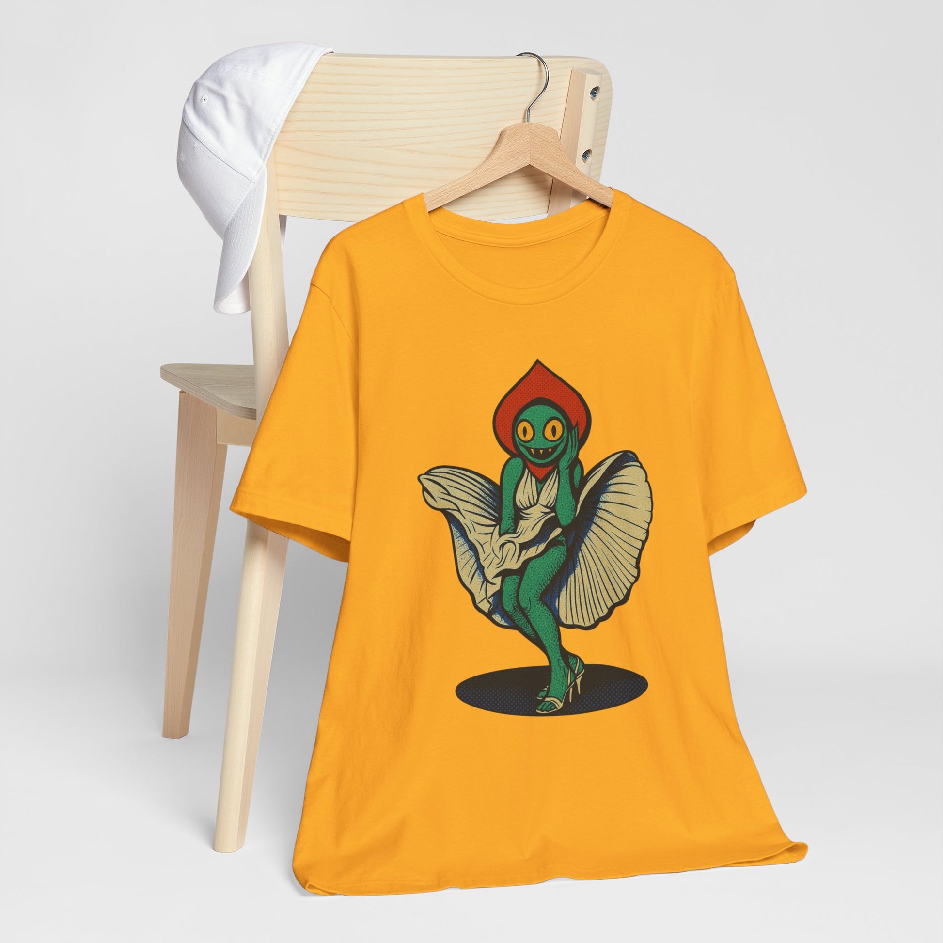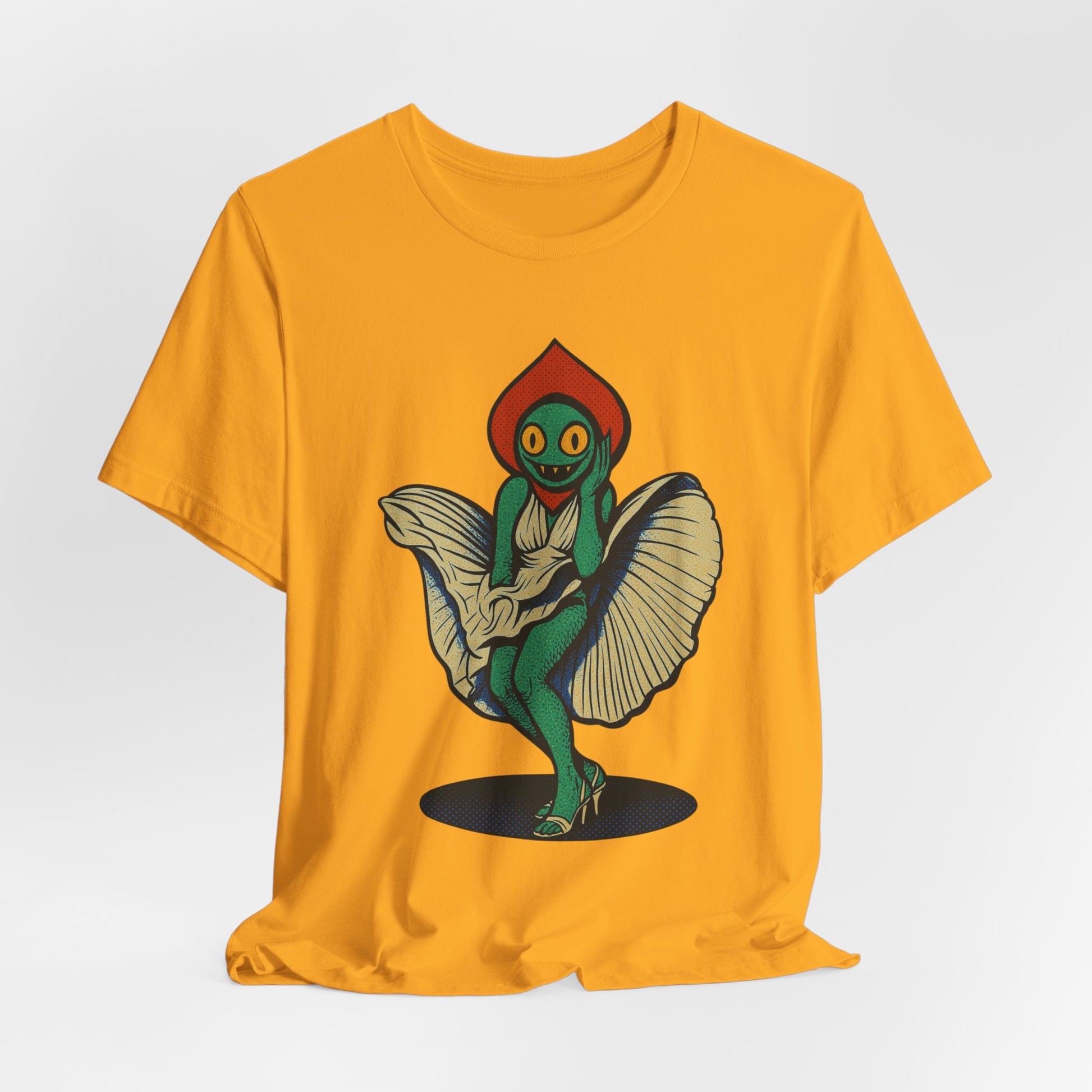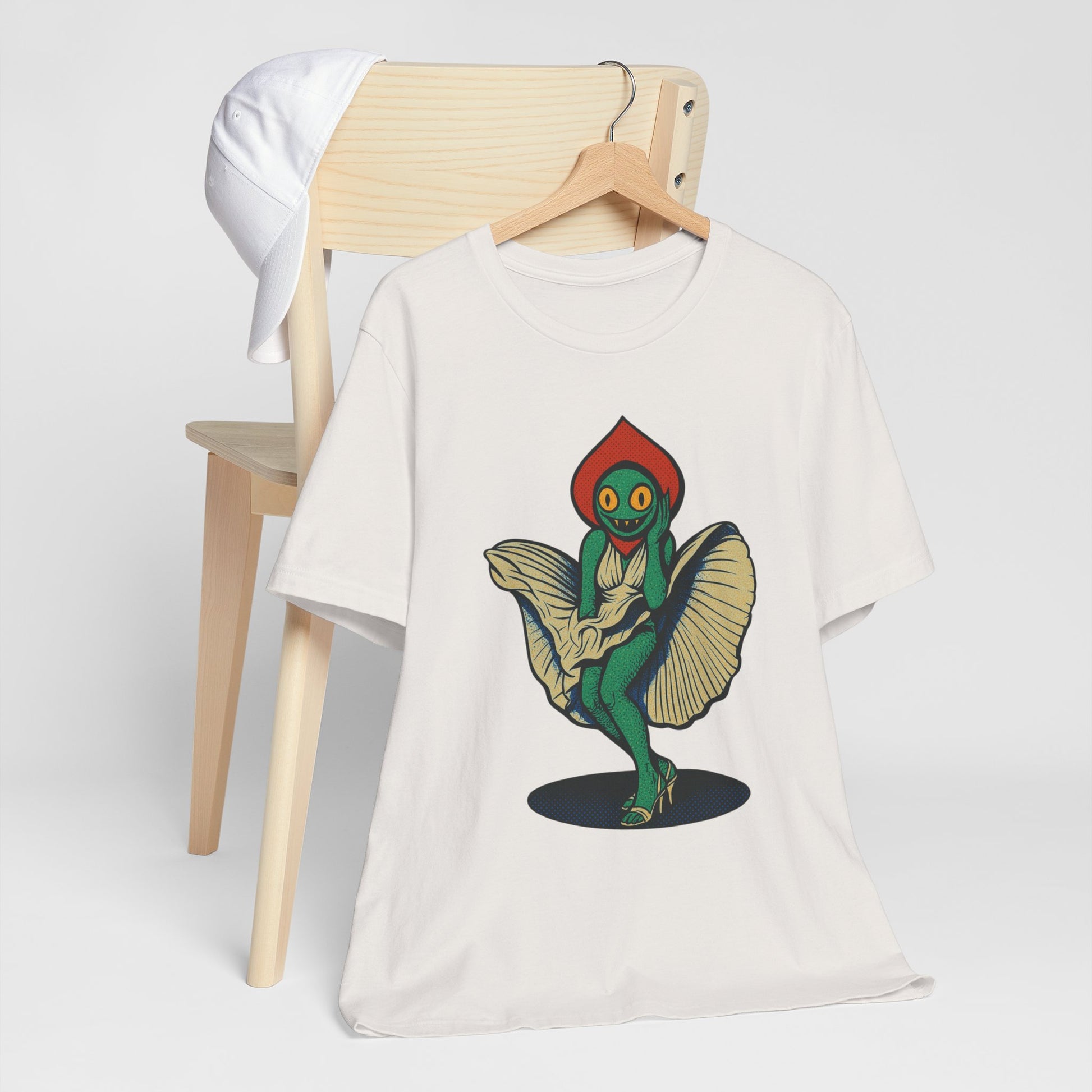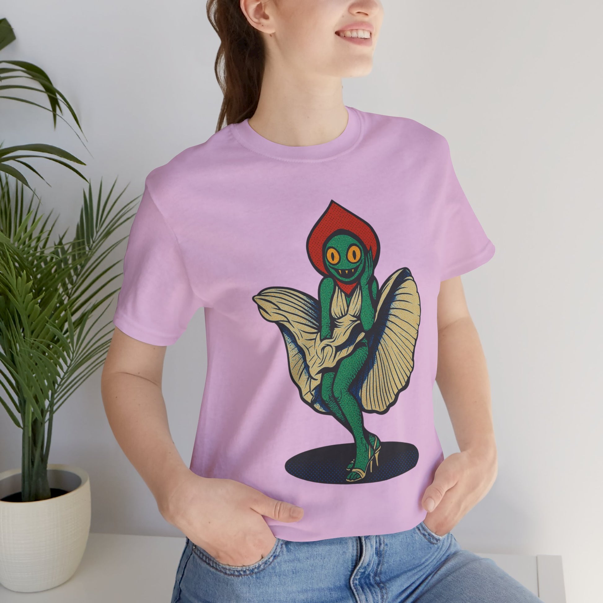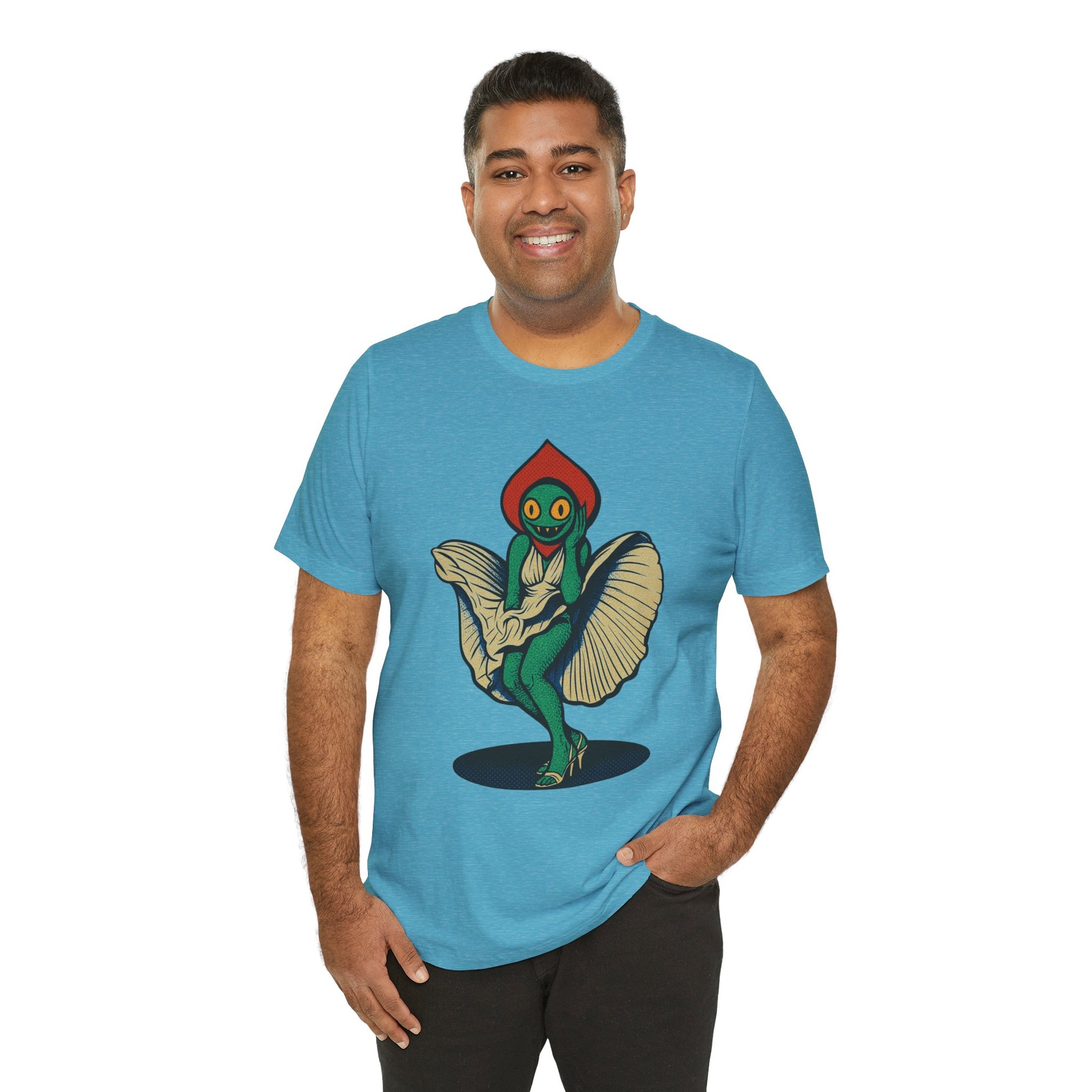 Embrace a unique blend of comfort and cosmic charm with this Unisex Jersey Short Sleeve Tee, inspired by the mysterious and legendary Flatwoods Monster of West Virginia folklore. Known for its glowing eyes, floating form, and eerie presence, this version adds a playful twist — a flirty alien cryptid who's just as curious about Earth as we are about the stars. Whether you're into UFO lore, love weird and wonderful designs, or just enjoy standing out, this shirt brings that quirky edge to your everyday wardrobe.